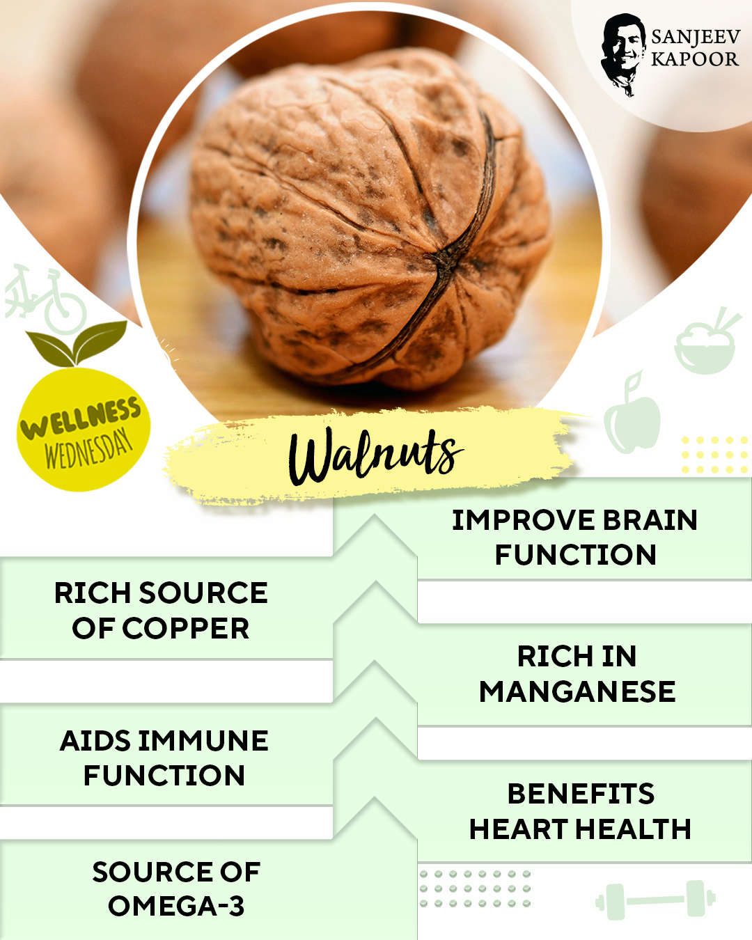 The omega-3 fatty acids present in the walnuts are also good for the brain. Having food rich in omega-3 fatty acids keeps the nervous system working smoothly and improves your memory.