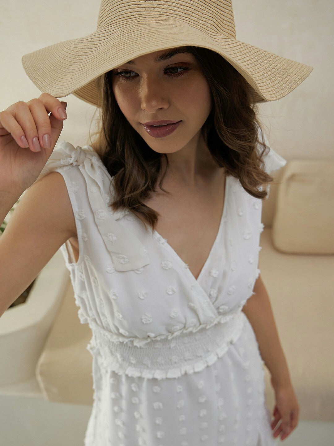 - Accessorized with a wide-brimmed hat and sunglasses for a boho-chic vibe.
